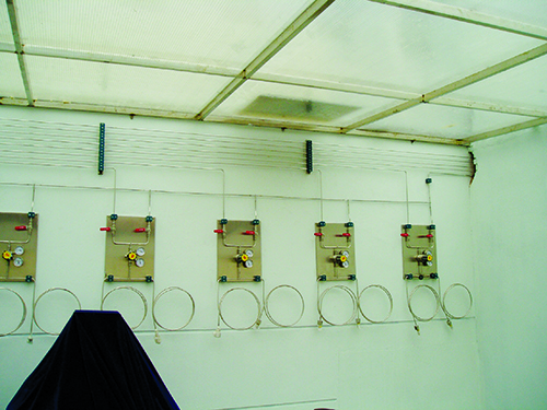 實驗室常用氣體主要有非燃氣體(氮氣、二氧化碳)、惰性氣體(氬氣、氦氣等)、易燃氣體(氫氣、一氧化碳);劇毒氣體(氟氣、氯氣);助燃氣體(氧氣)組成。一般氣相室配置氦氣(He)、氮氣(N2)。氣質聯用配置了氮氣、氫氣、氧氣,氫氣管線上的連接管件都要連接后焊接,嚴禁有泄漏的可能,所有的管線在安裝完畢后一定要做氣密性實驗,并在使用前要先除油,由于管道細小,管間距小,安裝過程中可依據現場情況進行調整,保證間距不小于45mm,氣瓶裝瓶時,易燃易爆與惰性氣體同柜,杜絕兩種易燃氣體鋼瓶裝同一氣瓶柜。